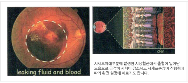 안 좋은 혈관(신생혈관)이 발생하여 혈액 내 체액성분과 혈액자체가 누출이 되어 급격하고 심각한 시력저하를 유발합니다.