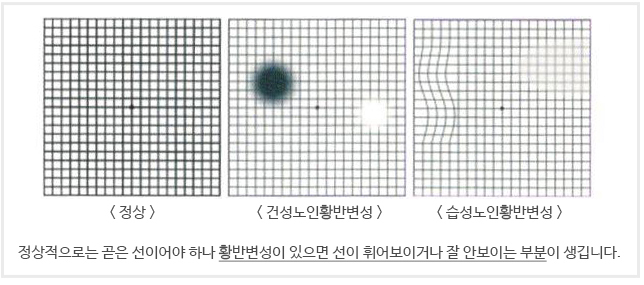 가정에서 이 질환의 진행을 확인하기 위해서 앰슬러씨 격자문의를 이용할 수 있습니다.